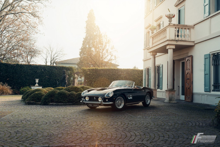 1915GT 250 GT SWB California Spider #3/56 8/60 Bianco then Nero/Nero then Nero/Rosso LHD EU eng. # 1915GT int. eng. # 544 F gearbox # 47, replaced with #94, differential # 267 F Steel, open headlights converted to covered headlights